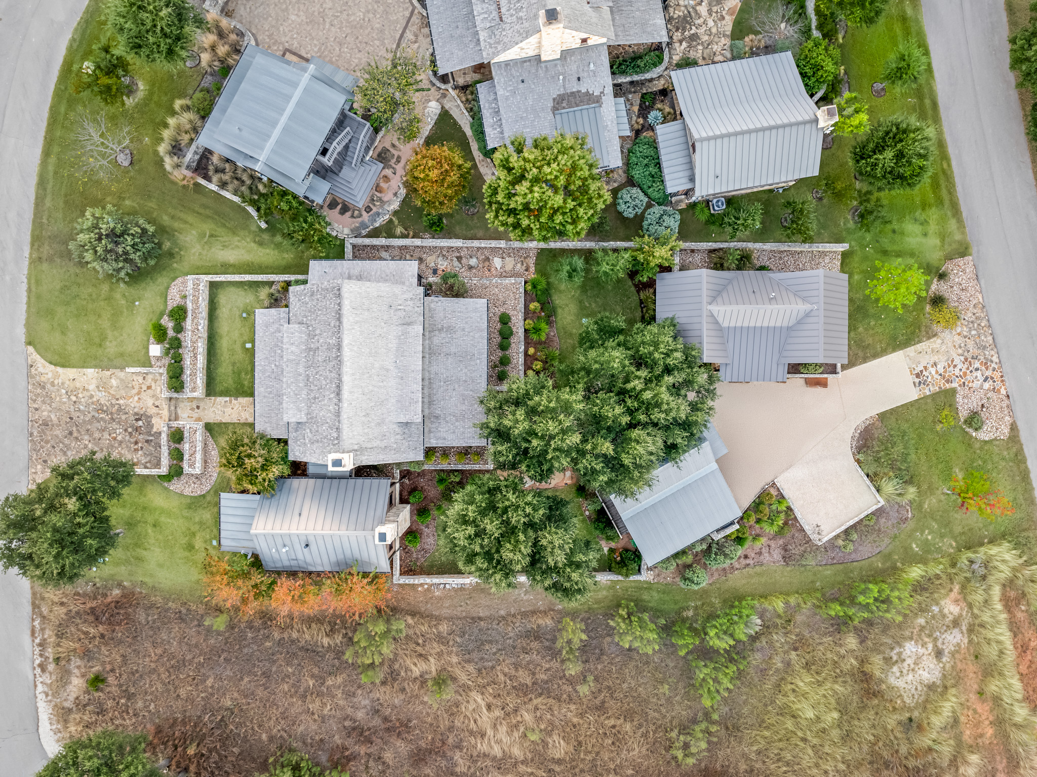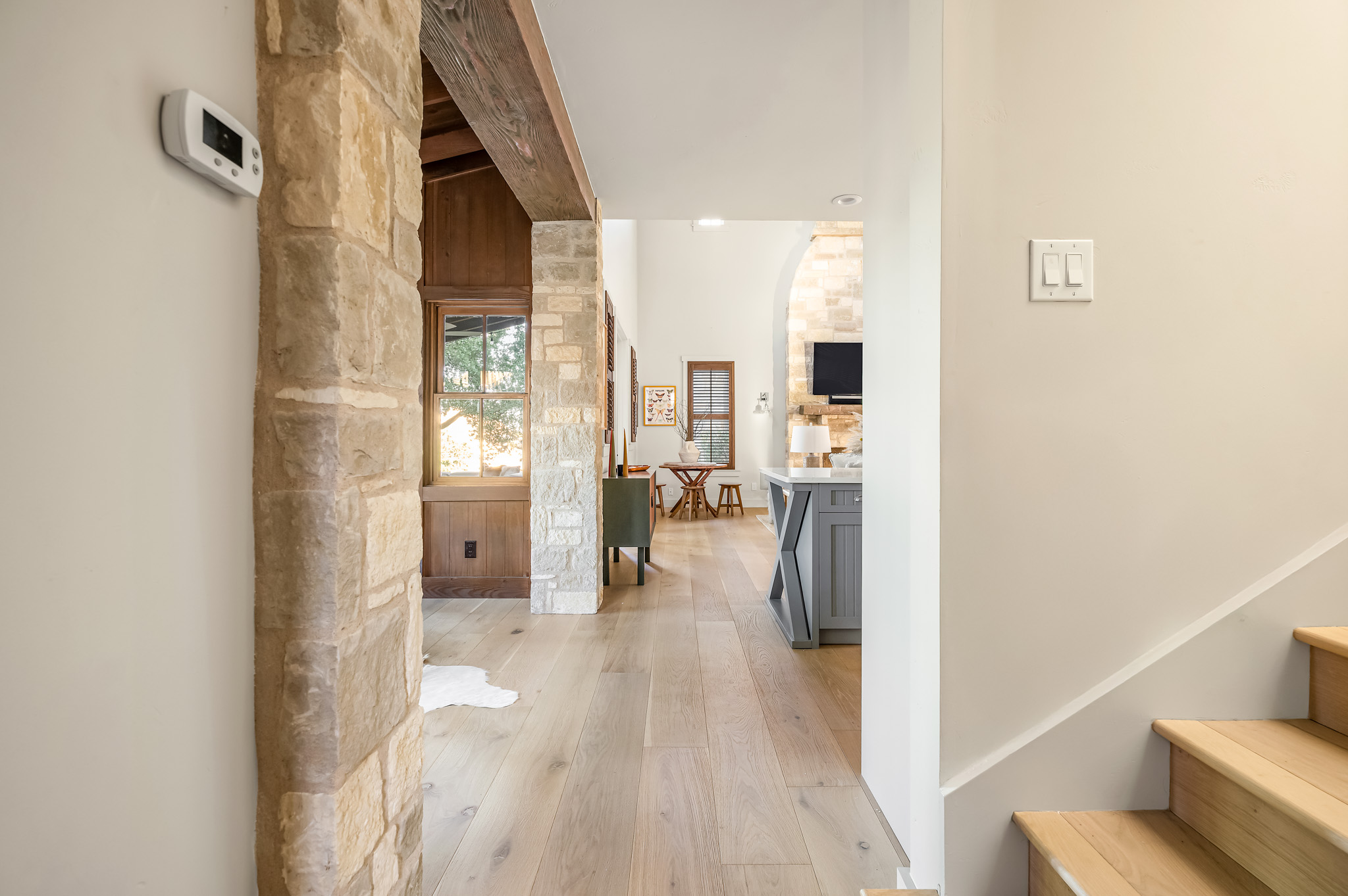 The two-story main gathering house welcomes with generous front and back limestone porches and a soaring great room anchored by a native-stone fireplace. The rustic dining area honors early Fredericksburg construction techniques, with wood walls and exposed ceiling beams adding warmth and authenticity. The open kitchen is both timeless and functional, appointed with premium appliances- including a dual-fuel range with a six-burner gas cooktop, farmhouse sink, and microwave drawer. Nearby, a pantry, spacious laundry room, and separate powder room add convenience and ease for both daily living and entertaining.
