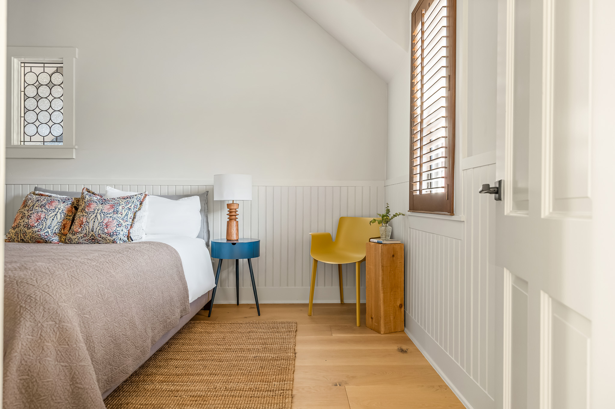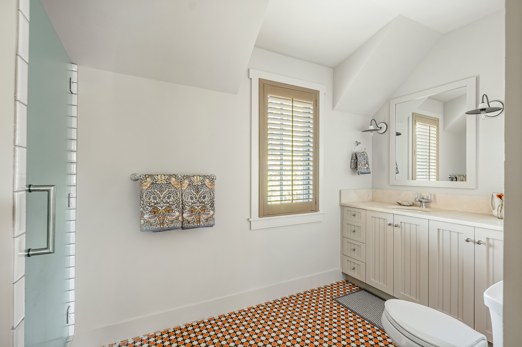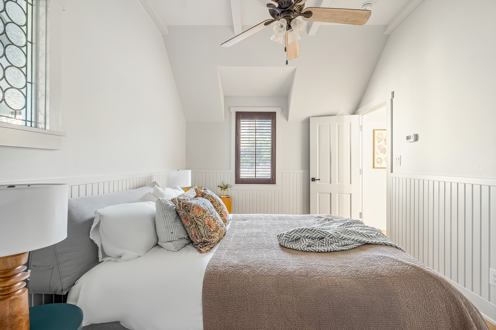 Upstairs, a secondary bedroom suite offers a generous en-suite bath featuring charming orange-tiled floors. The bedroom enjoys beautiful natural light and two decorative interior windows that overlook the expansive great room below, creating an inviting sense of openness and connection.